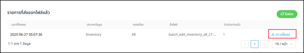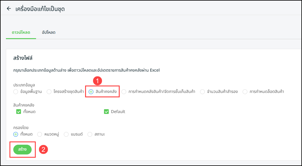 ขั้นตอนที่ 2: ภายใต้เมนูดาวน์โหลด ให้เลือกประเภทข้อมูลเป็น “ข้อมูลสต็อกสินค้า” (Inventory Info Type) > จากนั้นคลิก “สร้างไฟล์” (Generate)