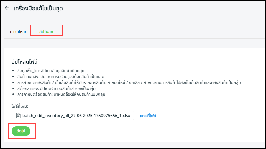 ขั้นตอนที่ 6: เมื่อดำเนินการเสร็จแล้ว ให้บันทึกไฟล์ Excel > กลับไปที่หน้าการแก้ไขแบบกลุ่มใน SiteGiant > คลิก “อัปโหลด” > อัปโหลดไฟล์ Excel > จากนั้นคลิก “ถัดไป”