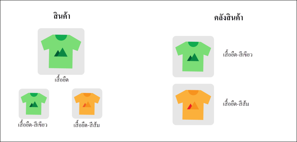 ในระบบสต็อก เสื้อยืดสีเขียวจะนับเป็นหนึ่งรายการสต็อก และเสื้อยืดสีส้มจะนับเป็นอีกรายการหนึ่ง