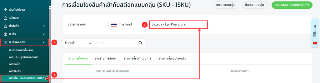 ขั้นตอนที่ 3: กลับมาที่ การเชื่อมโยงสินค้าเข้ากับสต็อก > เลือกร้านหลักที่ตั้งไว้ในขั้นตอนที่ 2 > ตอนนี้สินค้าทั้งหมดจะอยู่ในสถานะ เชื่อมโยงร่าง