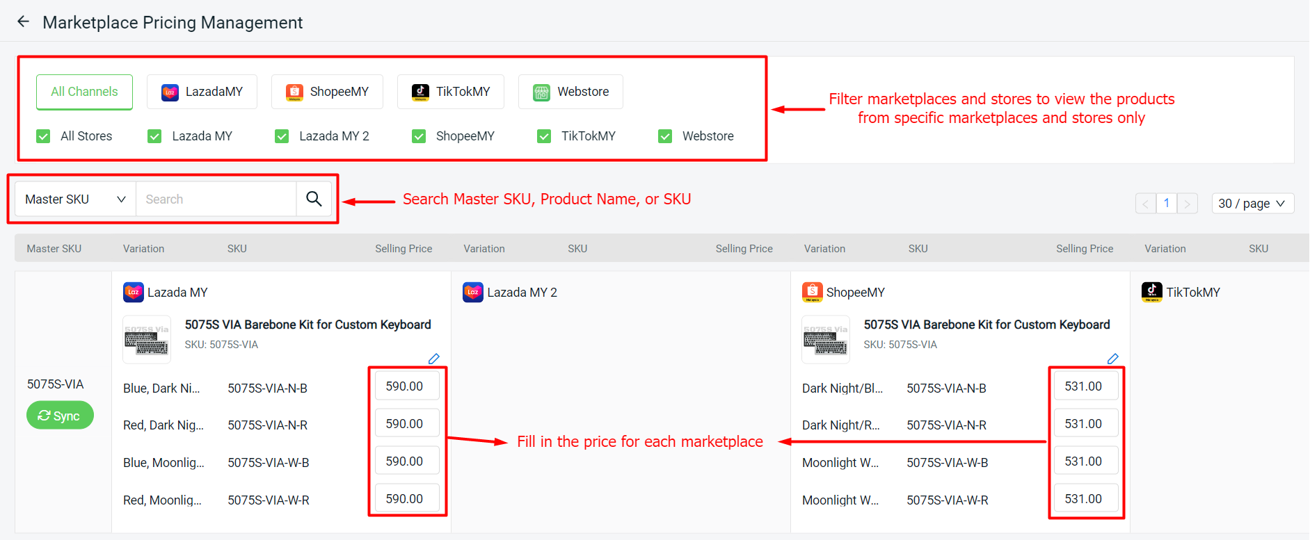 ขั้นตอนที่ 2: คุณสามารถเลือกมาร์เกตเพลส และร้านค้า ที่ต้องการดูได้ > นอกจากนี้ยังสามารถค้นหาด้วย Master SKU, ชื่อสินค้าหรือ SKU > กรอกราคาที่ต้องการซิงค์ในแต่ละมาร์เกตเพลส