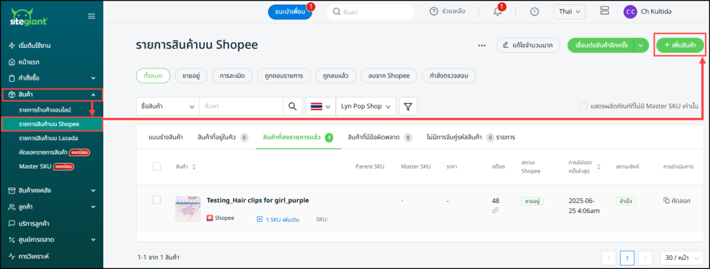 ขั้นตอนที่ 1: ไปที่เมนู สินค้า > รายการสินค้า Shopee > + เพิ่มสินค้า