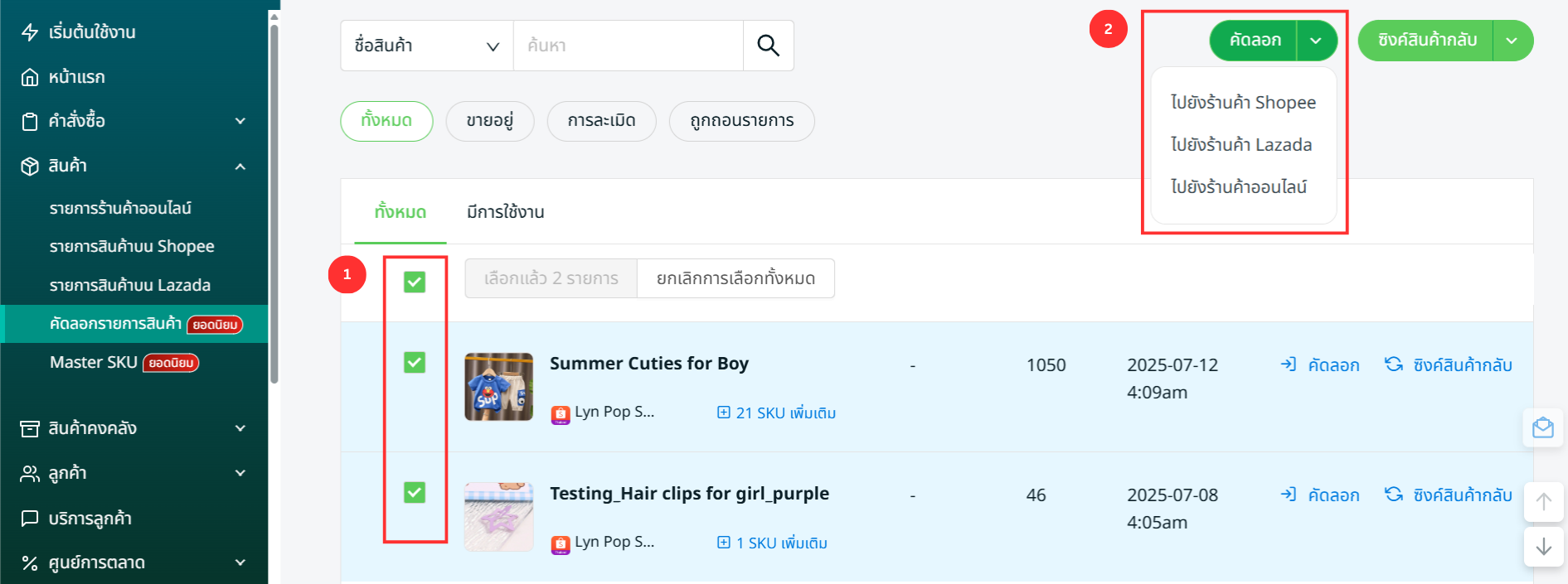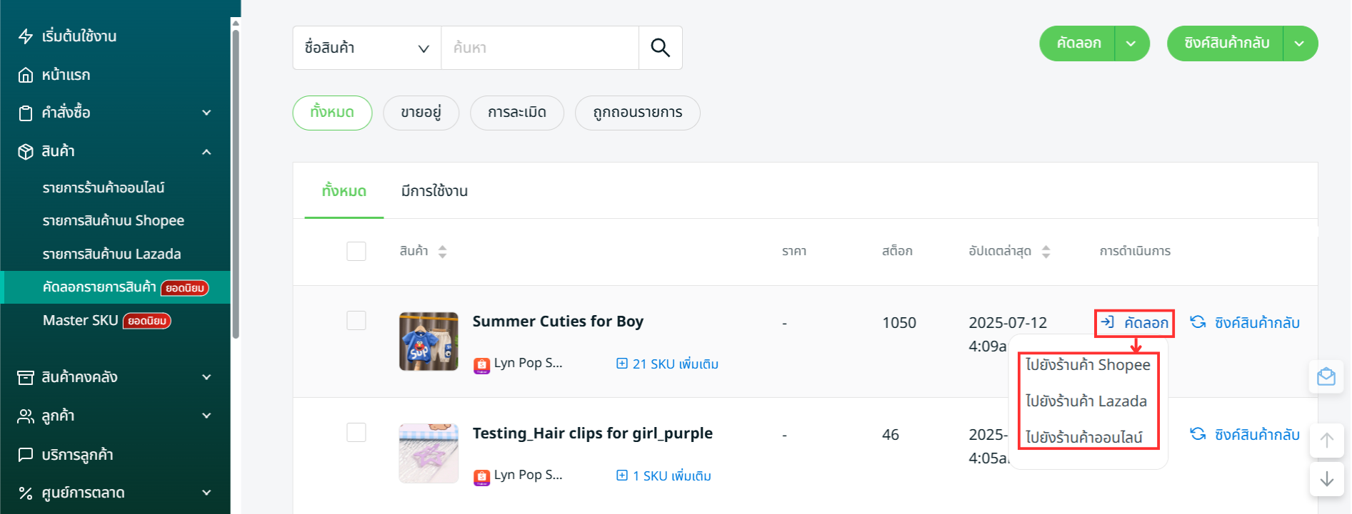 ขั้นตอนที่ 4: หากต้องการคัดลอกสินค้าหลายรายการพร้อมกัน ให้เลือกสินค้าที่ต้องการคัดลอก > คลิกปุ่ม คัดลอก ด้านบน > เลือกช่องทางขายที่ต้องการคัดลอกสินค้าให้ซิ้งค์ไป