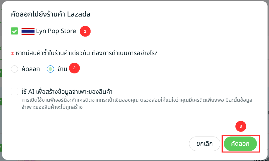 ขั้นตอนที่ 5: เลือกร้านค้าที่ต้องการคัดลอกสินค้าไป สามารถคัดลอกไปยังหลายร้านในมาร์เกตเพลสเดียวกันได้ > เลือกว่าจะ คัดลอก หรือ ข้าม หากมีสินค้าซ้ำในร้านเดียวกัน > คลิกปุ่ม คัดลอก