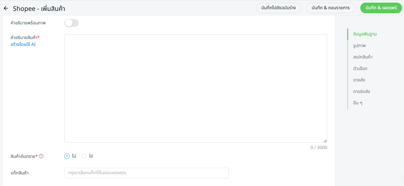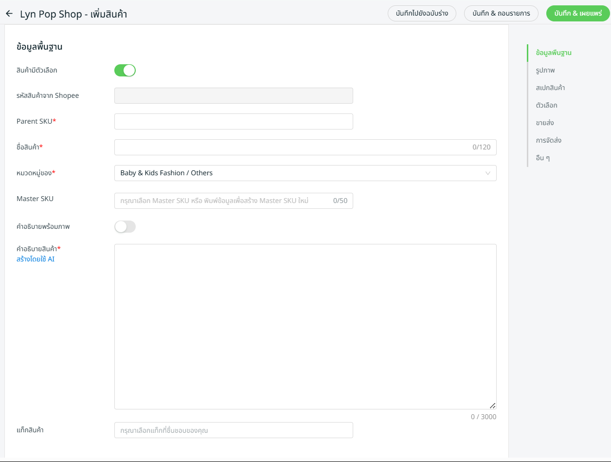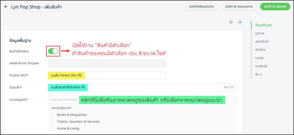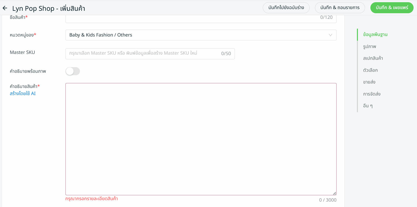 ขั้นตอนที่ 5: กรอกข้อมูลรายละเอียดสินค้า ตามหมวดหมู่ที่เลือก