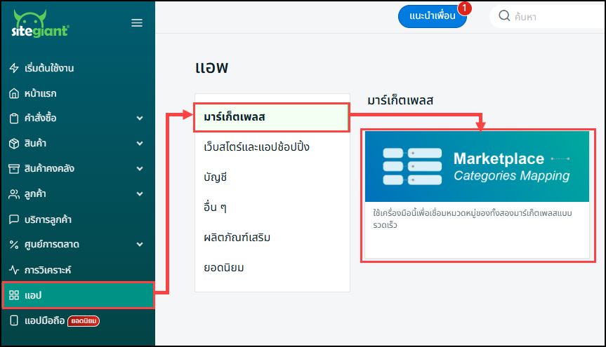 ขั้นตอนที่ 1: ไปที่ เมนูแอปพลิเคชัน (Apps) > มาร์เก็ตเพลส (Marketplaces) > การจับคู่หมวดหมู่มาร์เก็ตเพลส (Marketplace Categories Mapping)