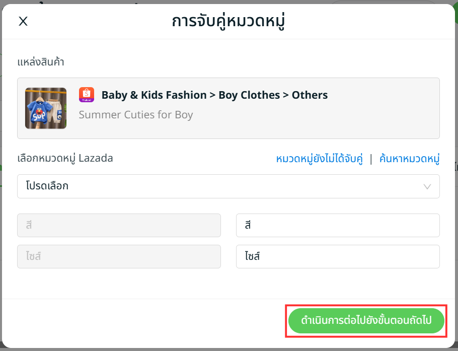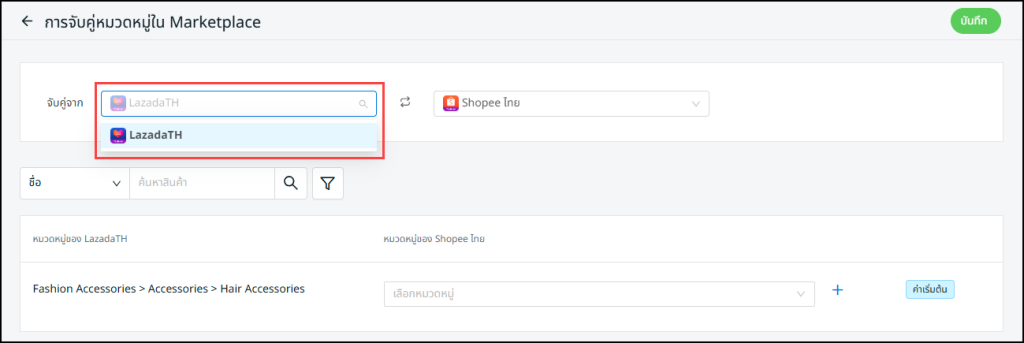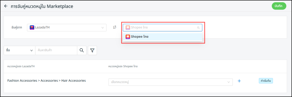 ขั้นตอนที่ 2: เลือกมาร์เก็ตเพลสต้นทางที่จะทำการจับคู่ > หมวดหมู่สินค้าของคุณในมาร์เก็ตเพลสนั้นจะแสดงรายการขึ้นมา