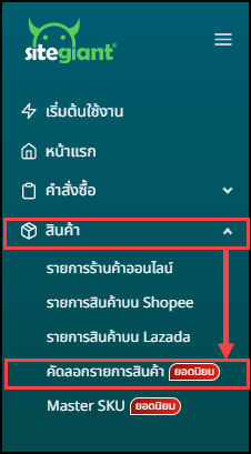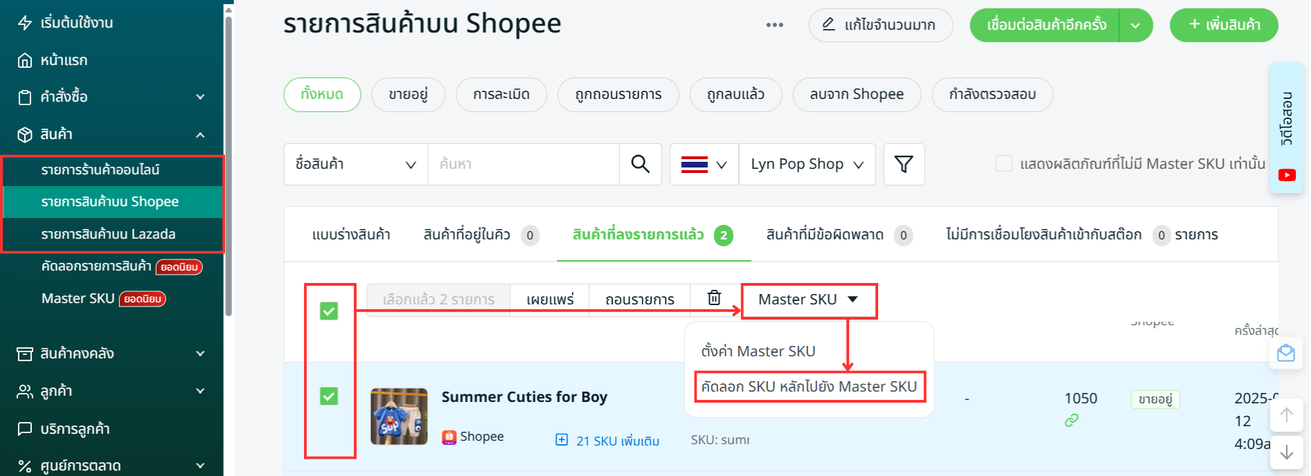ขั้นตอนที่ 1: ไปที่รายการสินค้าที่มีสินค้ามากที่สุด (Webstore/ Lazada / Shopee ) > เลือกสินค้าทั้งหมด > คัดลอก Parent SKU ไปยัง Master SKU