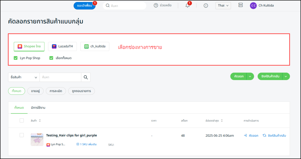 ขั้นตอนที่ 2: เลือกช่องทางการขายที่คุณต้องการคัดลอก > สินค้าของช่องทางการขายที่เลือกจะแสดงรายการขึ้นมา