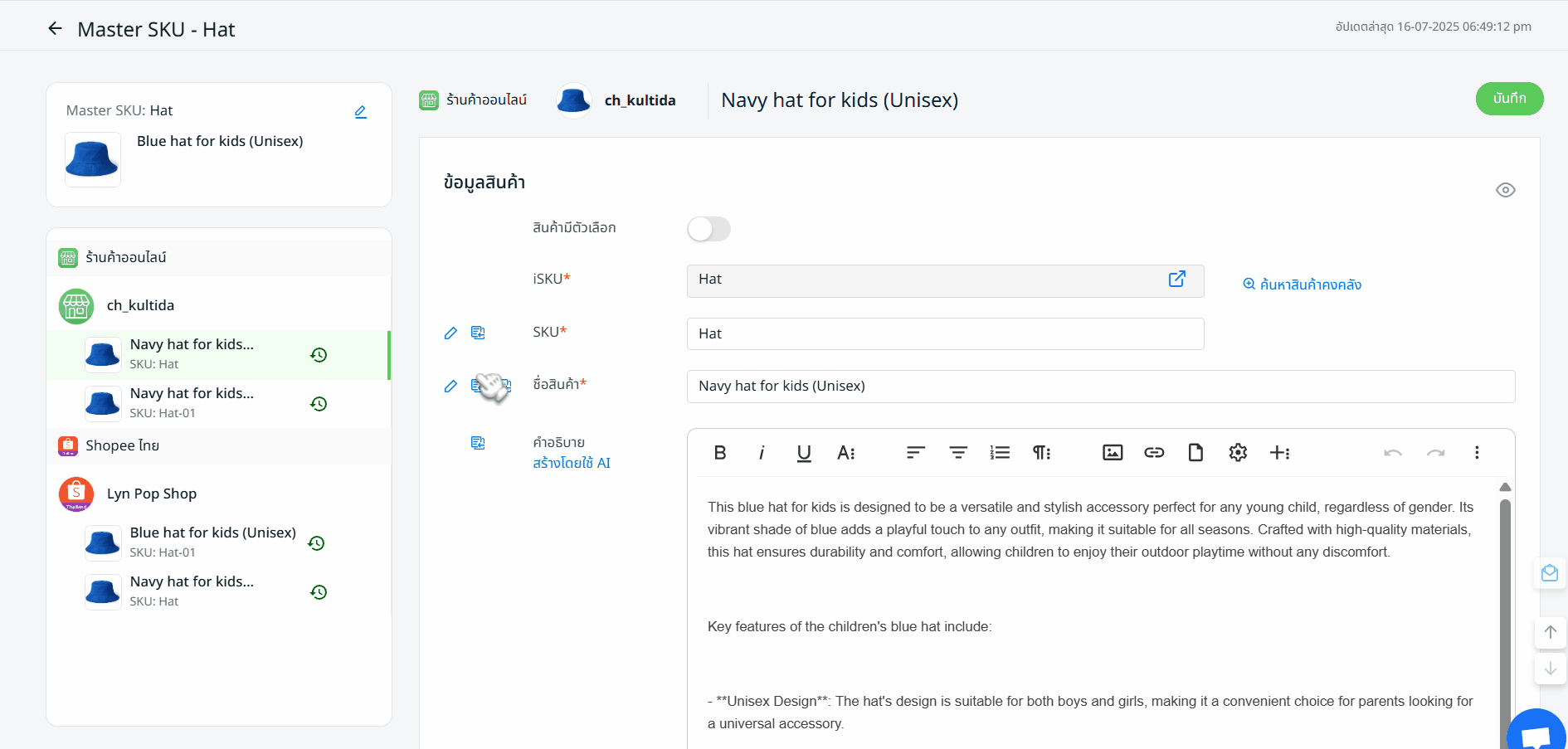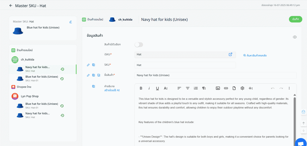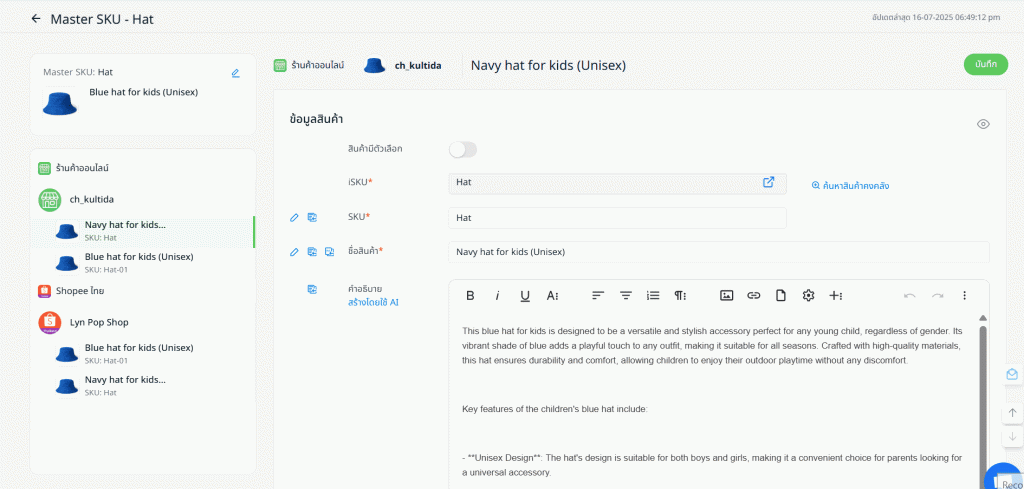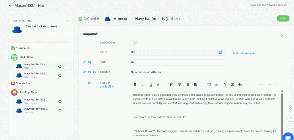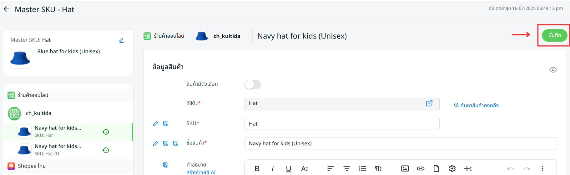 ขั้นตอนที่ 10: เมื่อแก้ไขรายละเอียดสินค้าเรียบร้อยแล้ว ให้คลิกปุ่ม บันทึก เพื่อซิงค์สินค้ากับมาร์เกตเพลสทั้งหมดพร้อมกัน