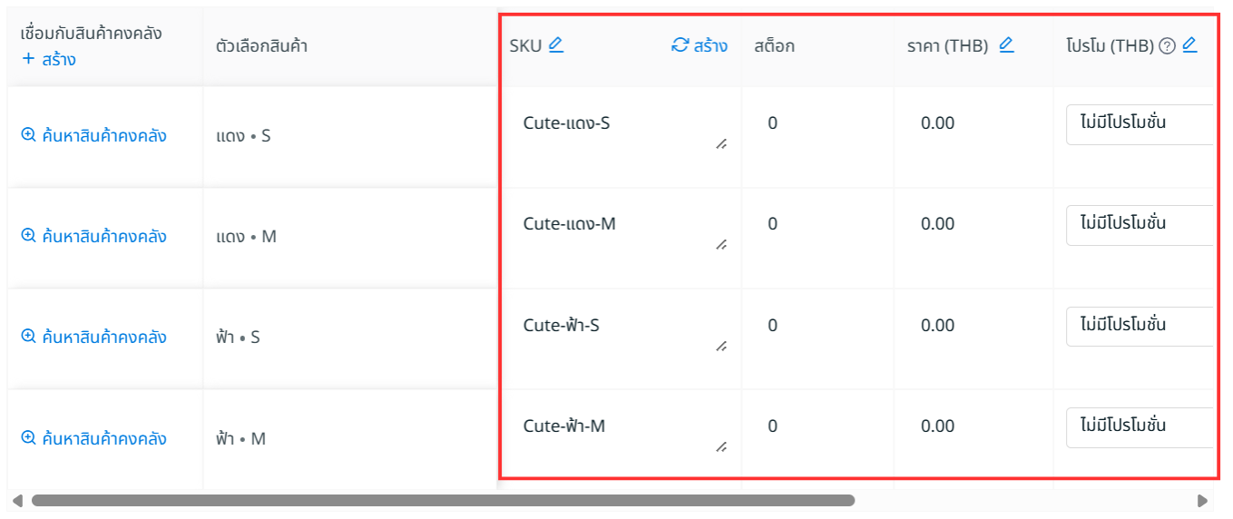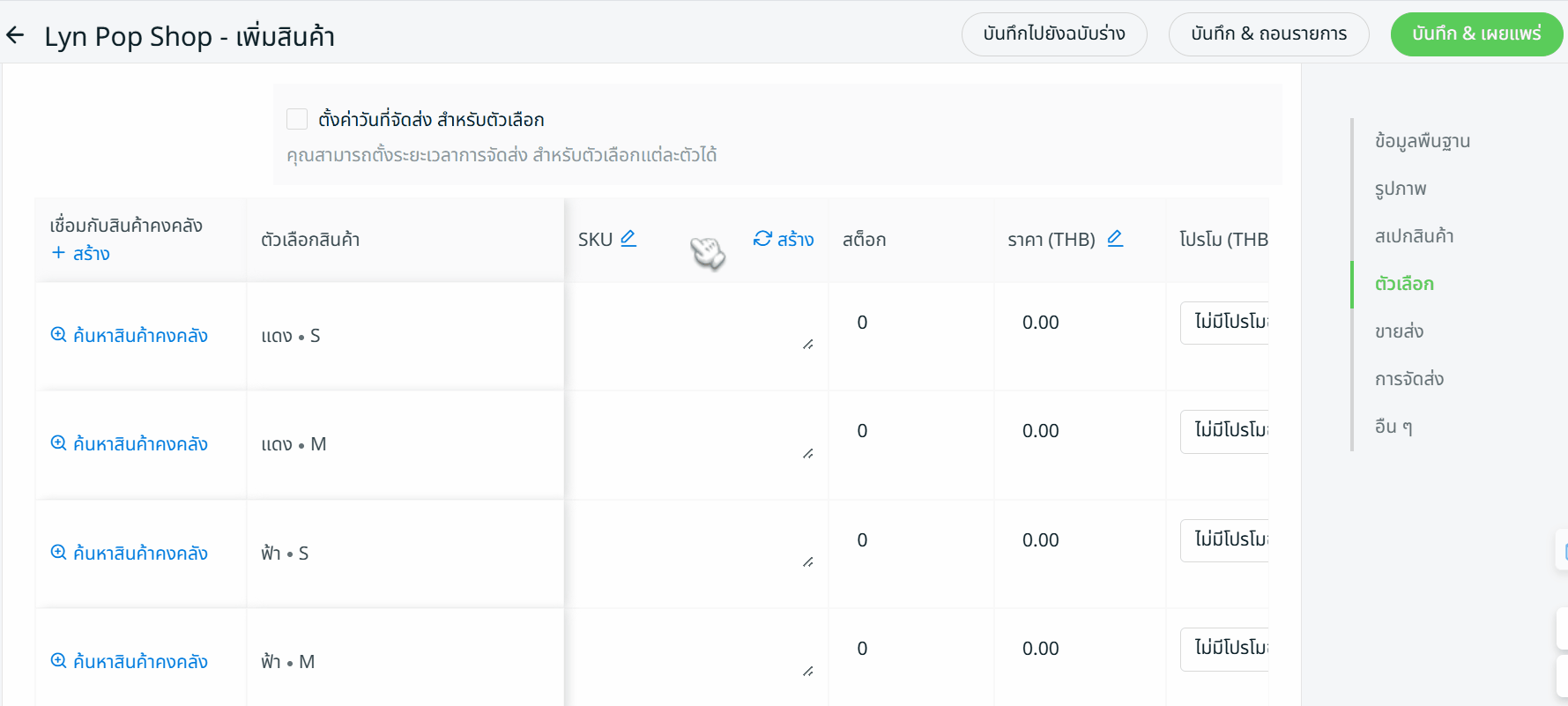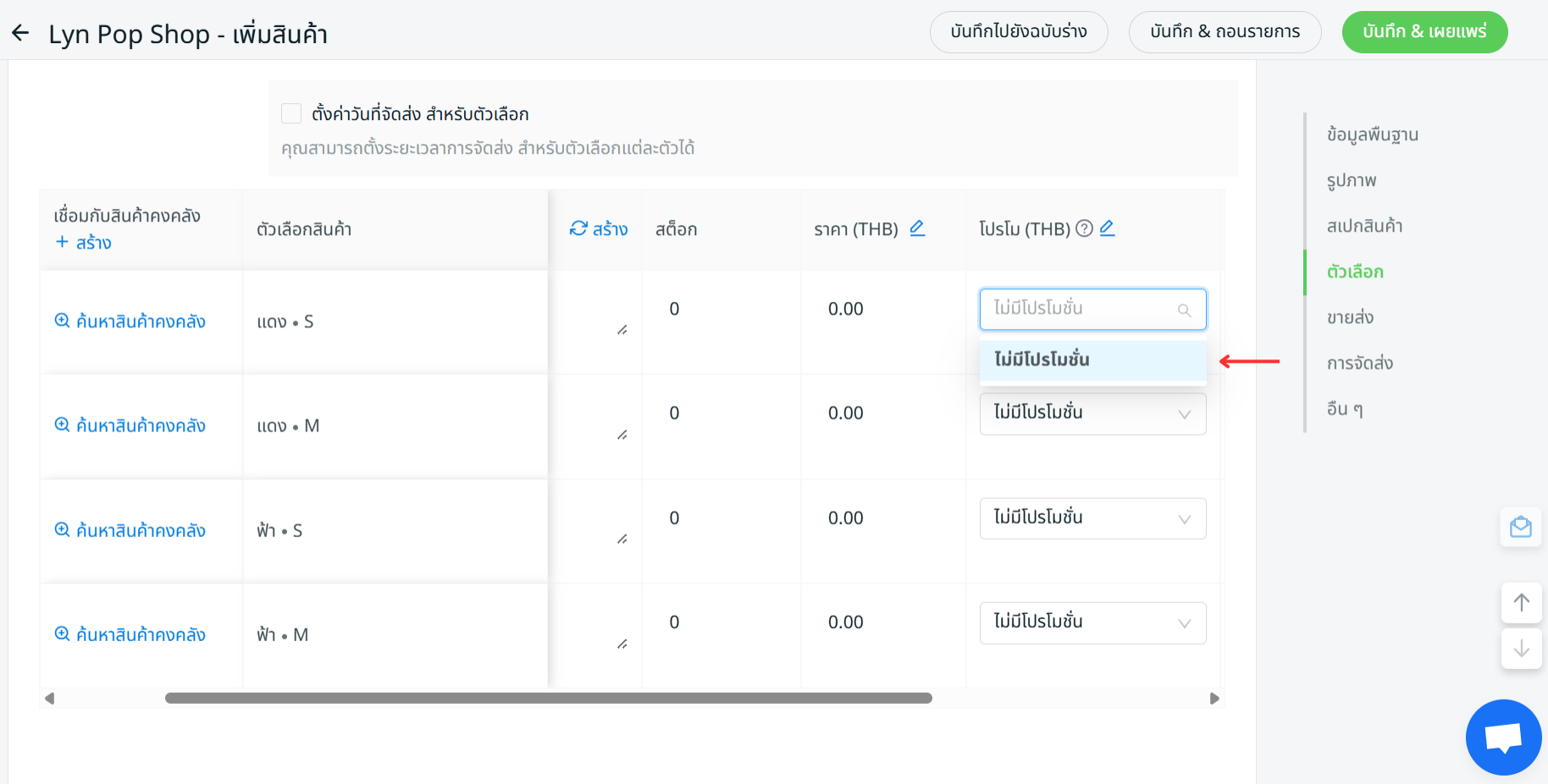 ขั้นตอนที่ 7: กรอกข้อมูล Variant SKU, จำนวนสต็อก, ราคาสินค้า และโปรโมชั่นสำหรับแต่ละตัวเลือก
