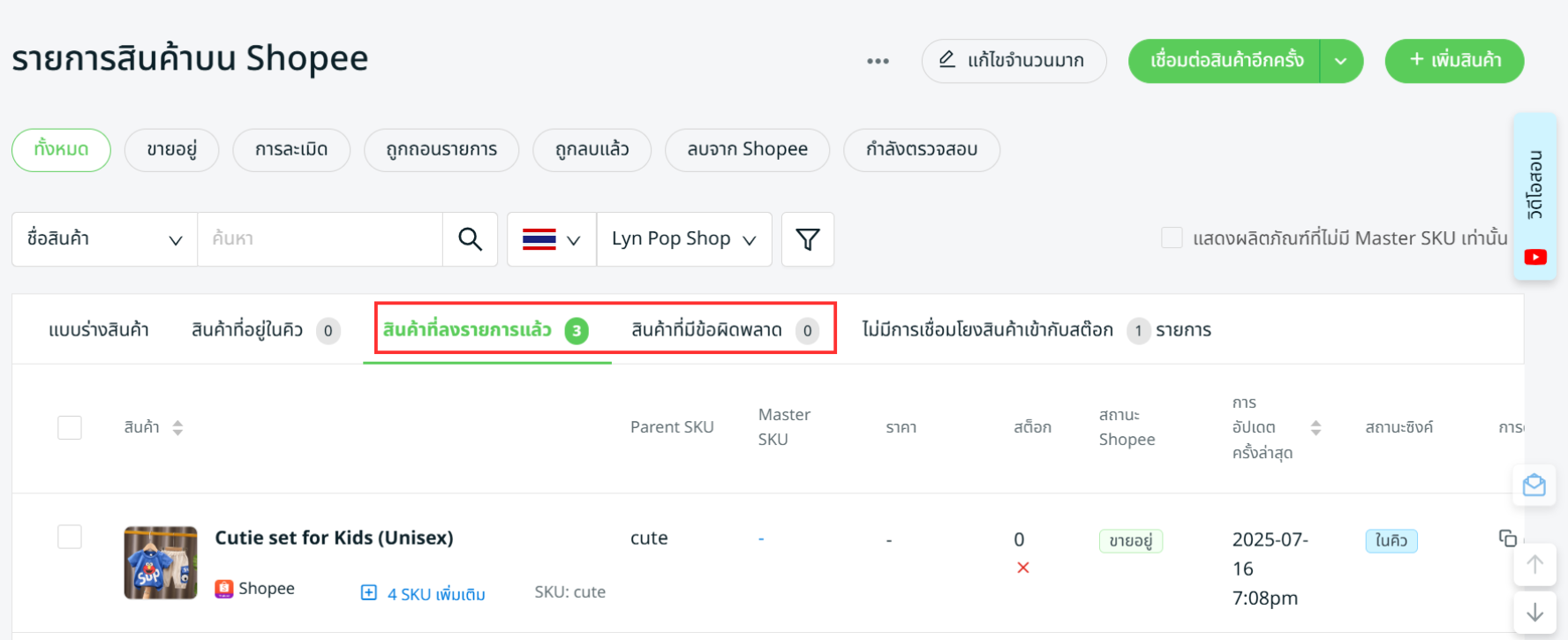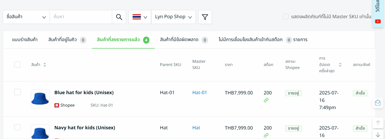 ขั้นตอนที่ 12: หากสินค้าซิงก์สำเร็จ จะปรากฏในรายการสินค้าที่ลงรายการแล้ว (Listed Products) หากมีข้อผิดพลาดในการซิงค์ จะย้ายไปที่แท็บสินค้าที่มีข้อผิดพลาด (Error Products) คุณสามารถตรวจสอบข้อความข้อผิดพลาด แก้ไขรายการสินค้า แล้วทำการซิงก์ใหม่อีกครั้ง