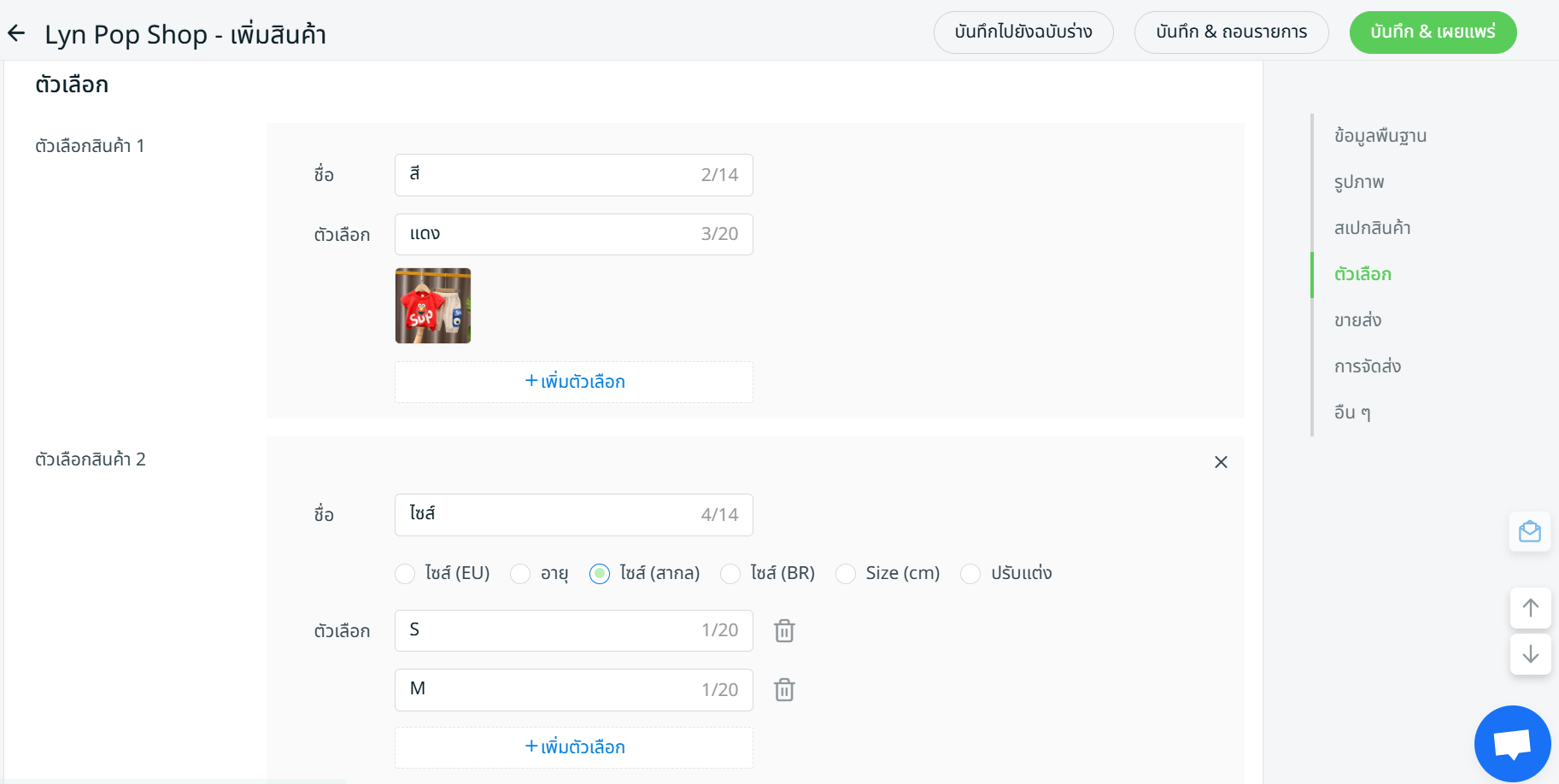 📌หมายเหตุ: สำหรับตัวเลือกประเภทเดียว (single-tier variation) สามารถเพิ่มตัวเลือกได้สูงสุด 50 ตัวเลือก สำหรับสองประเภทตัวเลือก ผลรวมของชุดตัวเลือกต้องไม่เกิน 50 ชุด