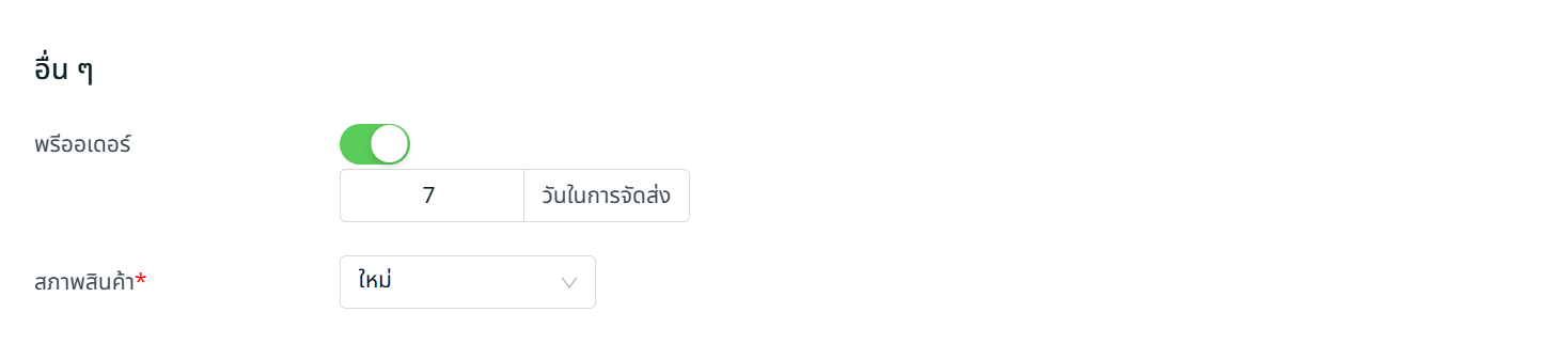 ขั้นตอนที่ 10: หากสินค้าของคุณเป็นสินค้าพรีออเดอร์ที่ต้องใช้เวลาจัดเตรียมสินค้านานขึ้น (7-30 วัน) คุณสามารถเปิดสถานะพรีออเดอร์ (Pre-order status) และตั้งจำนวนวันที่จะจัดส่ง > กำหนดสภาพสินค้าว่าเป็นสินค้าใหม่หรือมือสอง