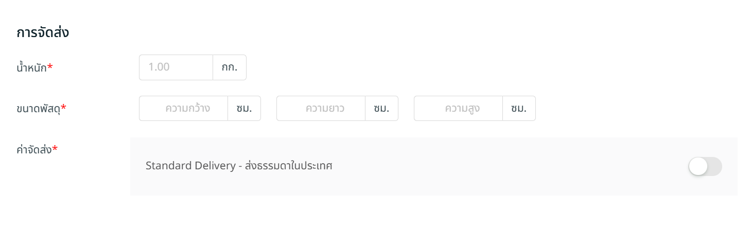 ขั้นตอนที่ 9: ในส่วนของการจัดส่ง ให้กรอกน้ำหนัก ขนาดพัสดุ (กว้าง x ยาว x สูง) และค่าจัดส่ง