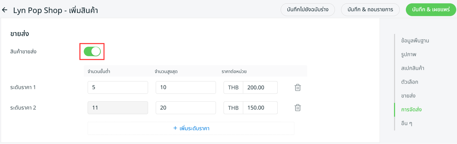 ขั้นตอนที่ 8: หากคุณต้องการสร้างโปรโมชั่นขายส่ง ให้เปิดใช้งานสถานะสินค้าขายส่ง แล้วตั้งค่า จำนวนขั้นต่ำต่อระดับราคา (Price Tier Quantity) และ หน่วยนับ (Unit)