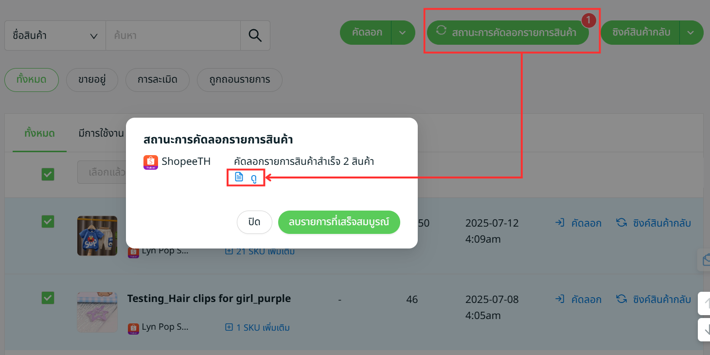 ขั้นตอนที่ 6: ระบบจะใช้เวลาสักครู่ในการคัดลอกสินค้า คุณสามารถคลิกที่ สถานะการคัดลอกสินค้า (Copy Listing Status) เพื่อตรวจสอบความคืบหน้า เมื่อเสร็จแล้ว คุณสามารถคลิกที่ ดูผลลัพธ์ (View) เพื่อตรวจสอบผลลัพธ์