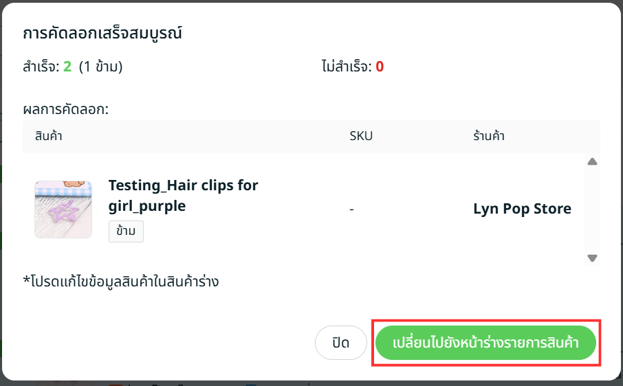 📌หมายเหตุ: การคัดลอกจะล้มเหลวหาก Parent SKU ว่างเปล่าหรือยาวเกินไป (สูงสุด 50 ตัวอักษร)