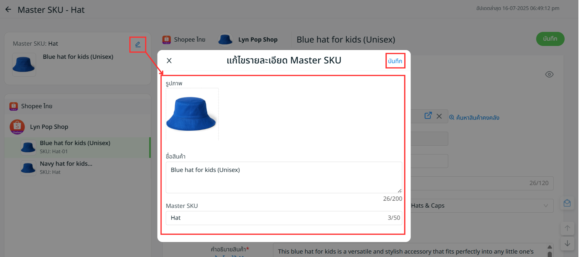 ขั้นตอนที่ 4: รูปภาพของ Master SKU จะไม่ถูกดึงมาจากรายการสินค้า คุณสามารถอัปโหลดรูปภาพและแก้ไข ชื่อสินค้าและ รหัส Master SKU โดยคลิกที่ Master SKU > คลิกไอคอนแก้ไข > บันทึก