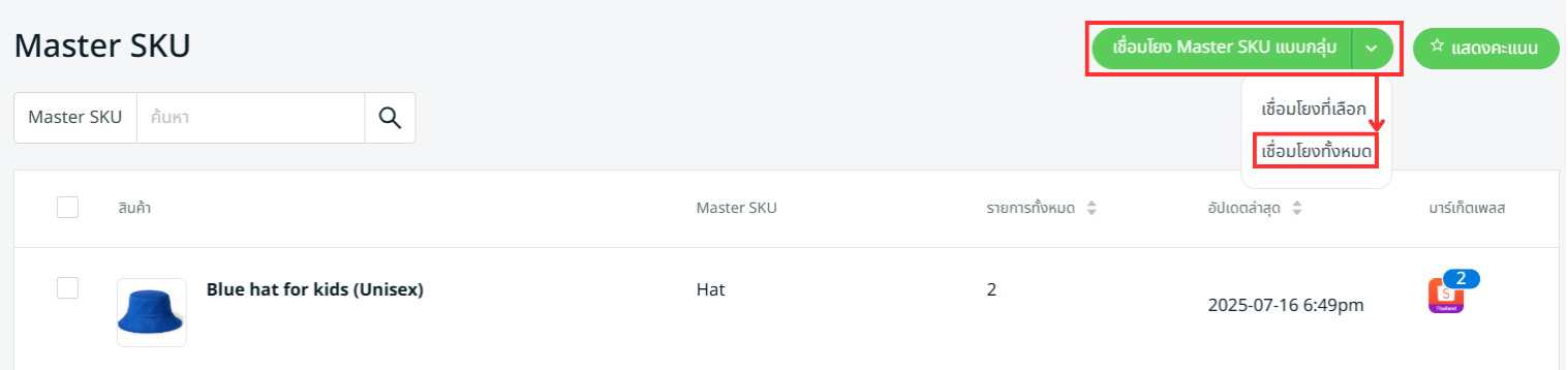 ขั้นตอนที่ 5: จากนั้น คุณสามารถใช้ฟีเจอร์ เชื่อมโยง Master SKU แบบกลุ่ม เพื่อเชื่อมโยงสินค้าที่เหมือนกันซึ่งใช้สินค้าคงคลังเดียวกัน (iSKU) ข้ามหลายตลาดโดยใช้ Master SKU ที่มีอยู่ จากนั้นไปที่ปุ่ม เชื่อมโยง Master SKU แบบกลุ่ม > เลือก เชื่อมโยงทั้งหมด