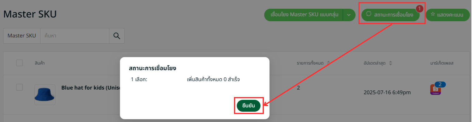 ขั้นตอนที่ 6: ระบบจะใช้เวลาสักครู่ในการเชื่อมโยงสินค้าแบบจำนวนมาก คุณสามารถคลิกที่สถานะการเชื่อมโยง (Link Status) เพื่อตรวจสอบความคืบหน้า เมื่อเสร็จแล้ว คุณจะเห็นจำนวนสินค้าที่ถูกเพิ่ม จากนั้นคลิก “ยืนยัน”