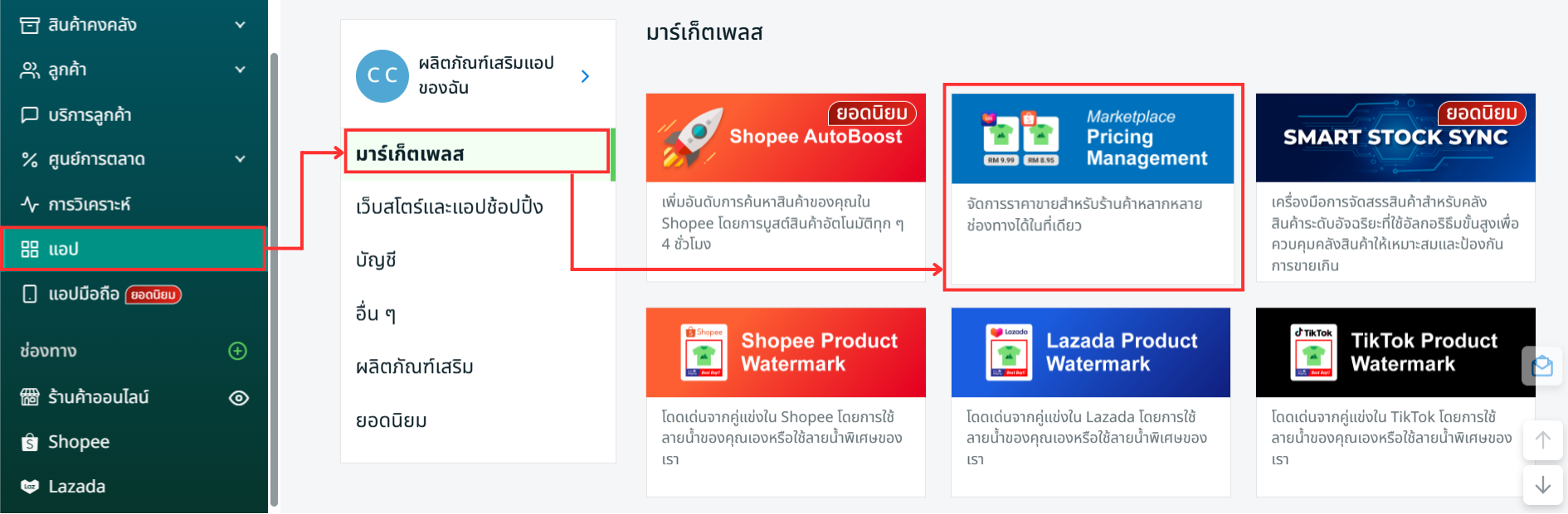 การจัดการราคาตลาด (Marketplace Pricing Management) ช่วยให้คุณจัดการราคาขายสินค้าและราคาส่งเสริมการขายของ Webstore , Lazada , Shopee , และ TikTok ได้ในที่เดียว เหมาะสำหรับกรณีที่ราคาสินค้าเพิ่มขึ้นหรือลดลง คุณสามารถใช้ฟีเจอร์นี้เพื่ออัปเดตราคาสินค้าใหม่ไปยังมาร์เกตเพลสต่าง ๆ ได้ นอกจากนี้ยังสามารถตั้งราคาที่แตกต่างกันสำหรับสินค้าของคุณและซิงค์ไปยังมาร์เกตเพลสต่าง ๆ ได้